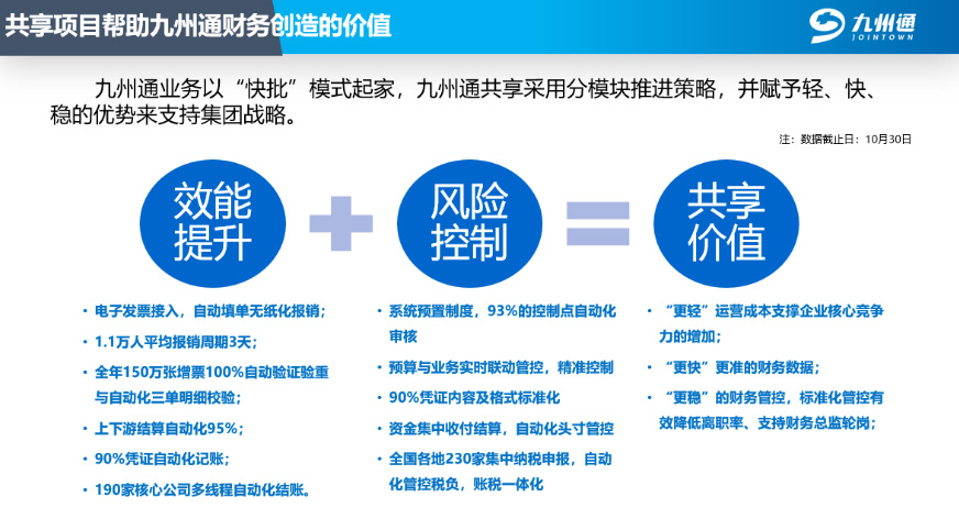 進(jìn)入數(shù)字化時(shí)代,九州通利用金蝶EAS、搭建的共享中心從三方面加強(qiáng)管控:第一,集團(tuán)管控方面,去除地區(qū)和業(yè)務(wù)之間的標(biāo)準(zhǔn)執(zhí)行偏差和內(nèi)部管理真空;第二,資金管控方面,共享中心以專業(yè)獨(dú)立的視角,審核費(fèi)用報(bào)銷、資金支付業(yè)務(wù),防范舞弊,提高威懾力;第三,項(xiàng)目管控方面,集團(tuán)共享中心集中處理業(yè)務(wù),避免因人員理解不同出現(xiàn)執(zhí)行偏差,提升總部對(duì)項(xiàng)目部的管控力度。從而方便公司進(jìn)行風(fēng)險(xiǎn)評(píng)估、合規(guī)自查,不斷提升合規(guī)管理水平,增強(qiáng)合規(guī)履職能力,確保公司高質(zhì)量發(fā)展。