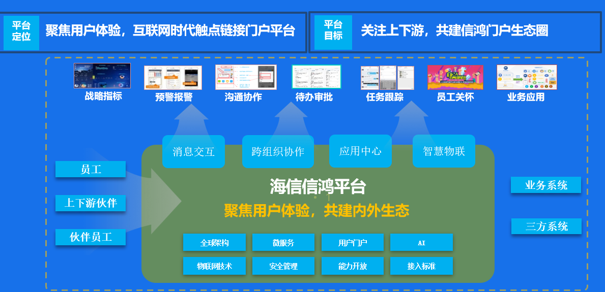 海信信鴻平臺(tái)旨在打造聚焦用戶體驗(yàn)、互聯(lián)網(wǎng)鏈接觸點(diǎn)的門戶平臺(tái)。平臺(tái)通過(guò)建設(shè)基礎(chǔ)業(yè)務(wù)能力,賦能用戶和上下游企業(yè),打造內(nèi)外生態(tài),實(shí)現(xiàn)實(shí)際業(yè)務(wù)場(chǎng)景支持,為海信集團(tuán)提供智能、高效、便捷、安全的辦公平臺(tái)體驗(yàn)。