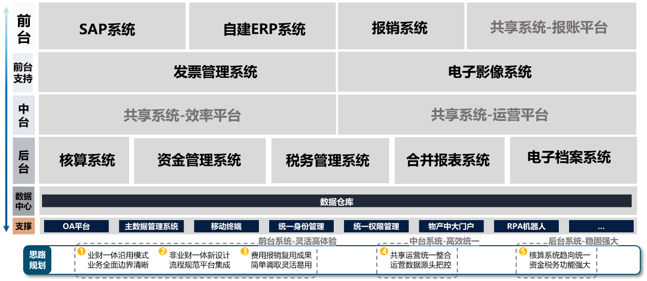 業(yè)務(wù)系統(tǒng)集成資金稅務(wù)檔案等系統(tǒng),實(shí)現(xiàn)業(yè)財(cái)資稅檔一體化;共享平臺兜底線下手工業(yè)務(wù)(如房租水電、股權(quán)分紅等),實(shí)現(xiàn)流程線上化和規(guī)范化;核算系統(tǒng)統(tǒng)一為4套,實(shí)現(xiàn)核算標(biāo)準(zhǔn)化;共享運(yùn)營平臺鏈接業(yè)務(wù)數(shù)據(jù)、資金數(shù)據(jù)、稅務(wù)數(shù)據(jù)、財(cái)務(wù)數(shù)據(jù)、主數(shù)據(jù),打破數(shù)據(jù)孤島,實(shí)現(xiàn)全數(shù)據(jù)整合和分析,將為戰(zhàn)略分析起到數(shù)據(jù)支撐作用。